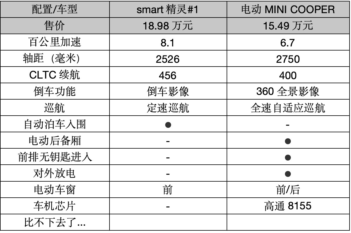即使如此,銷量依然不盡人意,相關(guān)數(shù)據(jù)顯示,其今年1-5月份上險量9099輛,同比下滑53.6%,況且smart精靈#1的配置還比電動MINI COOPER優(yōu)秀那么多!