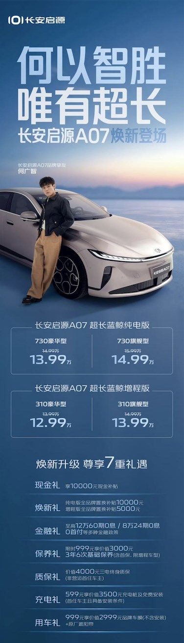 長(zhǎng)安啟源A07推超長(zhǎng)藍(lán)鯨增程版以及純電版,限時(shí)價(jià)12.99萬元起